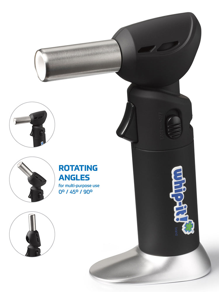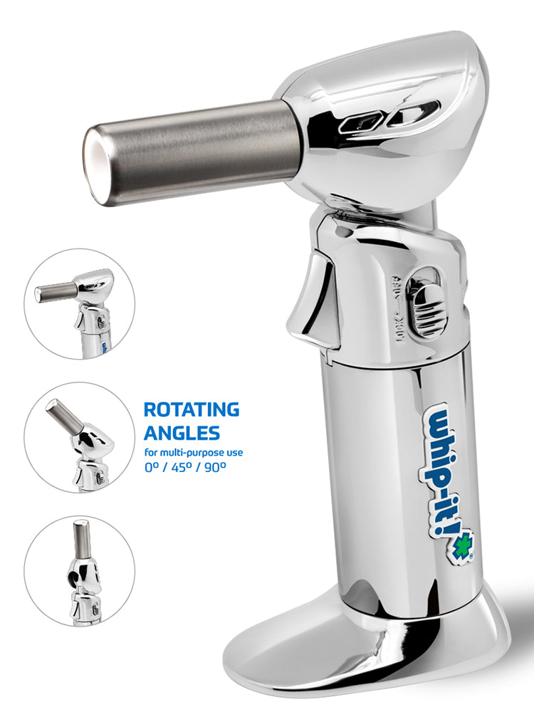 The Whip-It! Flex Torch features a unique flame nozzle that rotates in three different angles (0°, 45°, and 90°) for a variety of applications at home or professionally. Its Piezoelectric Ignition Technology coupled with a precision flame tip delivers unparalleled power and five-star performance. The Flex Torch is available in a collection of colors and includes a carrying case and recipes booklet.