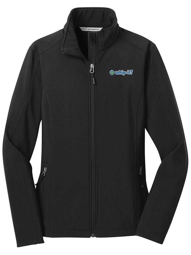 Introducing the Whip-It! Brand Women's Jacket (soft shell)! Comfortable, reliable, and a go-to basic that repels rain and protects against wind. Its clean silhouette and traditional black color makes for a casual or professional sleek look.